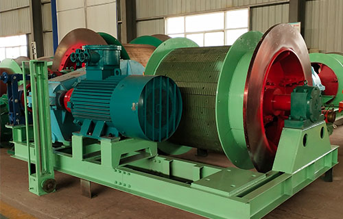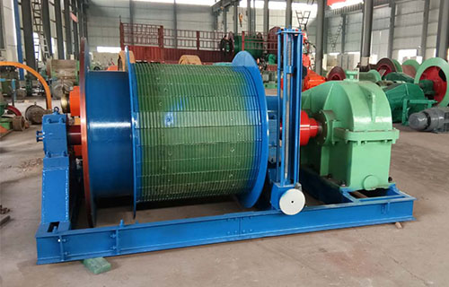 該提升絞車的主軸裝置有固定卷筒、活動卷筒(僅雙筒用)主軸、兩個軸承座、調繩機構(僅雙筒用)等部分組成,用來纏繞或釋放鋼絲繩。單筒提升絞車鋼絲繩為上出繩,雙筒提升絞車活動卷筒為下出繩,固定卷筒為上出繩,卷筒上裝有襯木。