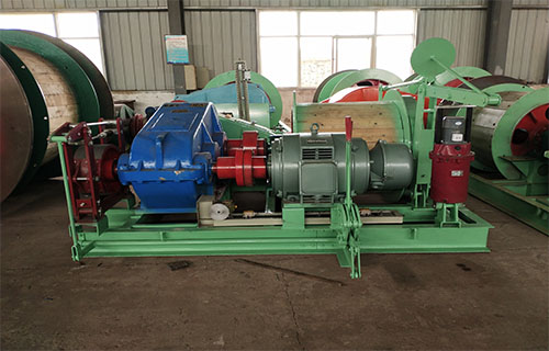 該提升絞車的主軸裝置有固定卷筒、活動卷筒(僅雙筒用)主軸、兩個軸承座、調繩機構(僅雙筒用)等部分組成,用來纏繞或釋放鋼絲繩。單筒提升絞車鋼絲繩為上出繩,雙筒提升絞車活動卷筒為下出繩,固定卷筒為上出繩,卷筒上裝有襯木。