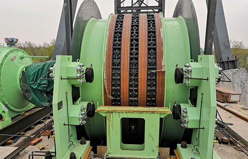 JKMD型多繩摩擦式提升機采用低速電動機時可不用減速器,電動機直接與卷筒主軸相連,或?qū)㈦妱訖C轉(zhuǎn)子裝在卷筒主軸的末端。傳動功率大時,可采用2臺或4臺電動機同時驅(qū)動。一臺提升機的總功率已達到11600千瓦。制動系統(tǒng)是保證提升機安全運行的重要裝置。遇緊急情況時,制動系統(tǒng)應(yīng)通過可調(diào)節(jié)制動力矩的液壓系統(tǒng)產(chǎn)生兩級安全制動,以保證提升機及時停車又不生產(chǎn)制動過猛現(xiàn)象。交流電動機驅(qū)動的提升機。其制動系統(tǒng)還要具有靈敏的制動力矩可能性能,以準確控制提升機在臨近通車點時的運行速度。